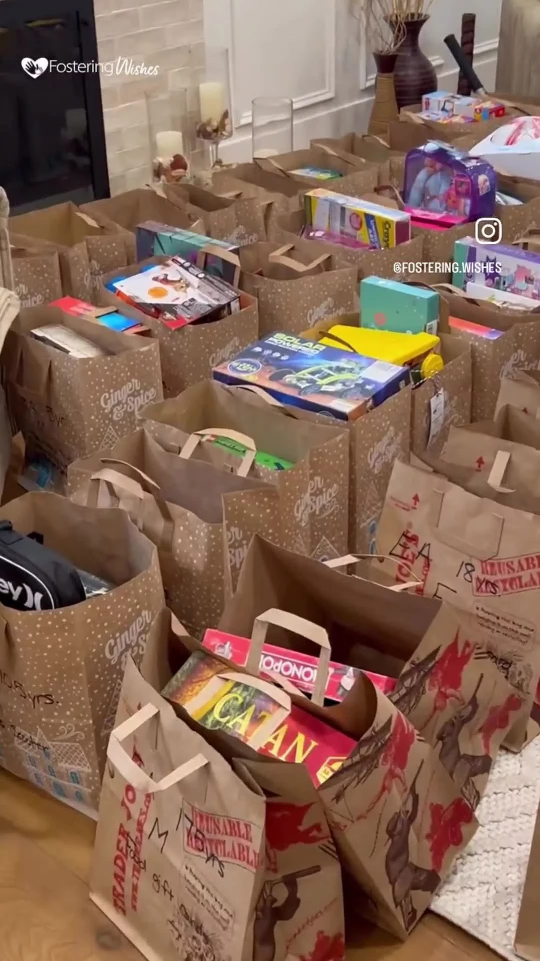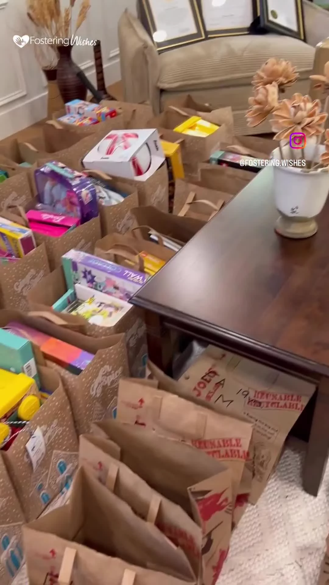 Sorting and bagging the gifts for our foster youth. Each bag contains the gifts for each foster youth - the bags are labelled with the age and gender (F/M/N).